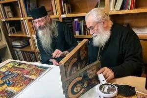 Archbishop Damianos of Sinai and Raitho (right) and Archimandrite Father Justin, the librarian of Saint Catherine's Monastery, inspect the woodwork and color of the icon replicas being produced by Legacy Icons.